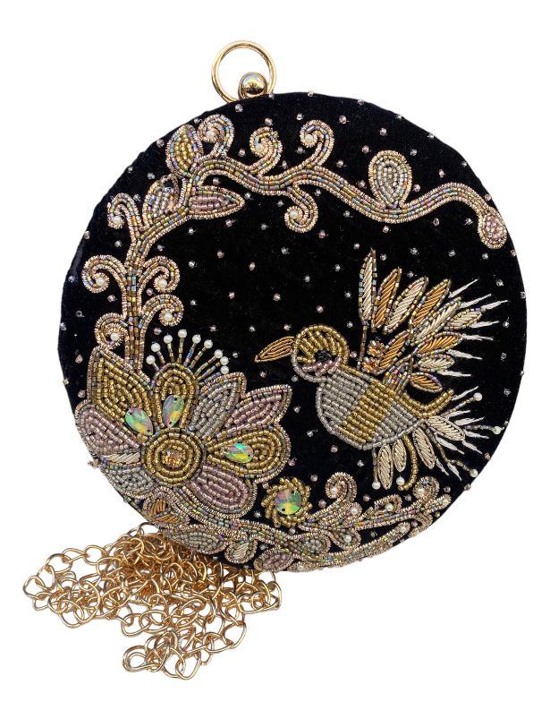 Black velvet round clutch with floral & bird hand embroidery in bead & cut dana work. Comes with a sling.